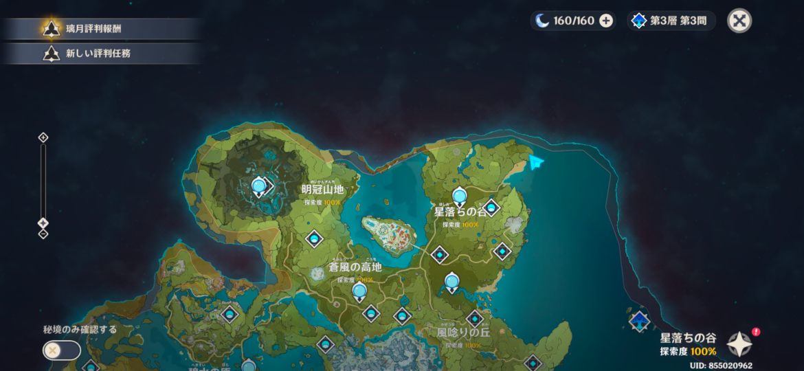 レンポ島 100%。宝箱1つとたぶんモラ石1つがどうしてもわからず、残ってる。
